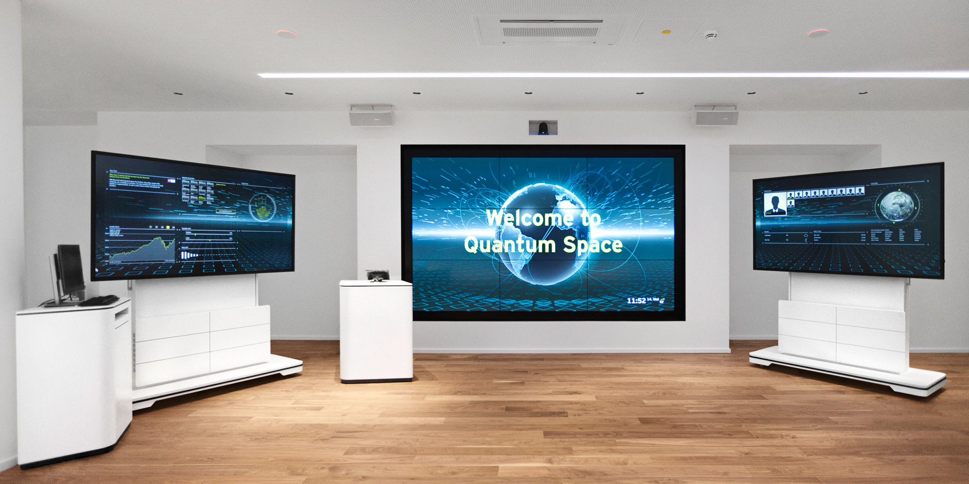 Interactive wavespace. For interactive, hybrid and virtual customer workshops. In the center a large, interactive media wall. Flanked by two mobile, height-adjustable editions of our Media furniture_S1 XL with interactive 84 " displays.